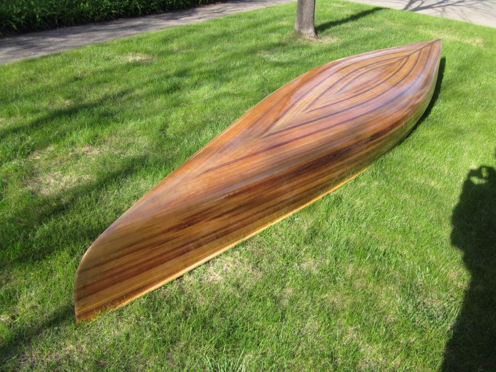 Cedar strips are laid on forms into the hull shape, and then covered with an epoxy/fiberglass, followed by marine varnish.