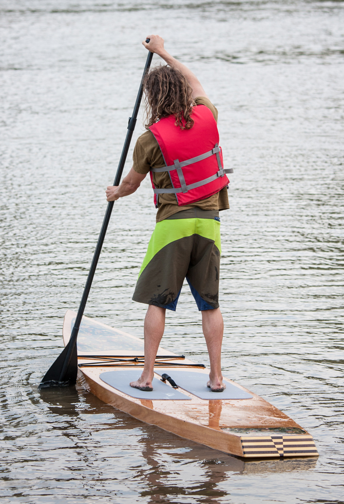 A wooden paddleboard? Why not! Our wood construction paddleboards are stable, fast, and lightweight. Designs have recently become available for wood SUPs. SUPs can be made with a marine plywood deck with colored-cloth accents, or with a cedar strip deck. Our “test paddlers” said this 30-lb board is stable enough for beginners and rivaled foam racing boards for speed.
